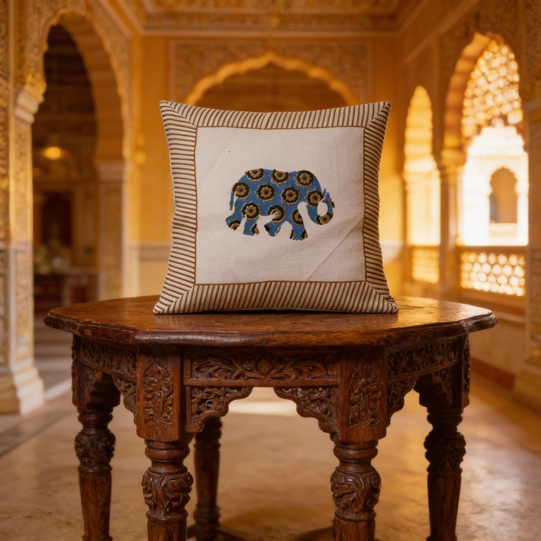 Hand Block Printed Cotton Cushion Covers with Central Elephant Motif (Set of 2)