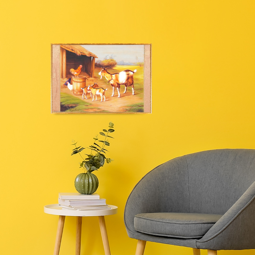 In 'Bearded Wanderers', Jaggu Prasad paints an affectionate glimpse of pastoral life, a family of goats and a few barnyard companions gathered outside a humble shed. The golden light glances softly across their coats, revealing every texture — from the coarse fur of the adults to the downy softness of the kids. Prasad’s brush captures their curiosity and calm with the same quiet reverence he gives to his wild subjects, blurring the line between domestic and untamed grace. The setting, a sun-warmed countryside shelter, punctuated by gentle earthy tones, reflects a simple rhythm of coexistence. It is a tender moment, translated through the discipline of miniature realism.