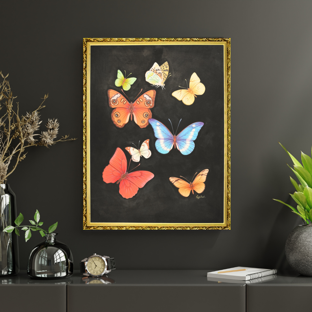 Celestial Whispers by Jaggu Prasad is a luminous portrayal of butterflies set against a deep, velvety background. Each wing glows with vivid life; scarlet, saffron, azure, and lemon tones harmoniously dance across the surface, creating a rhythmic symphony of colour and form.