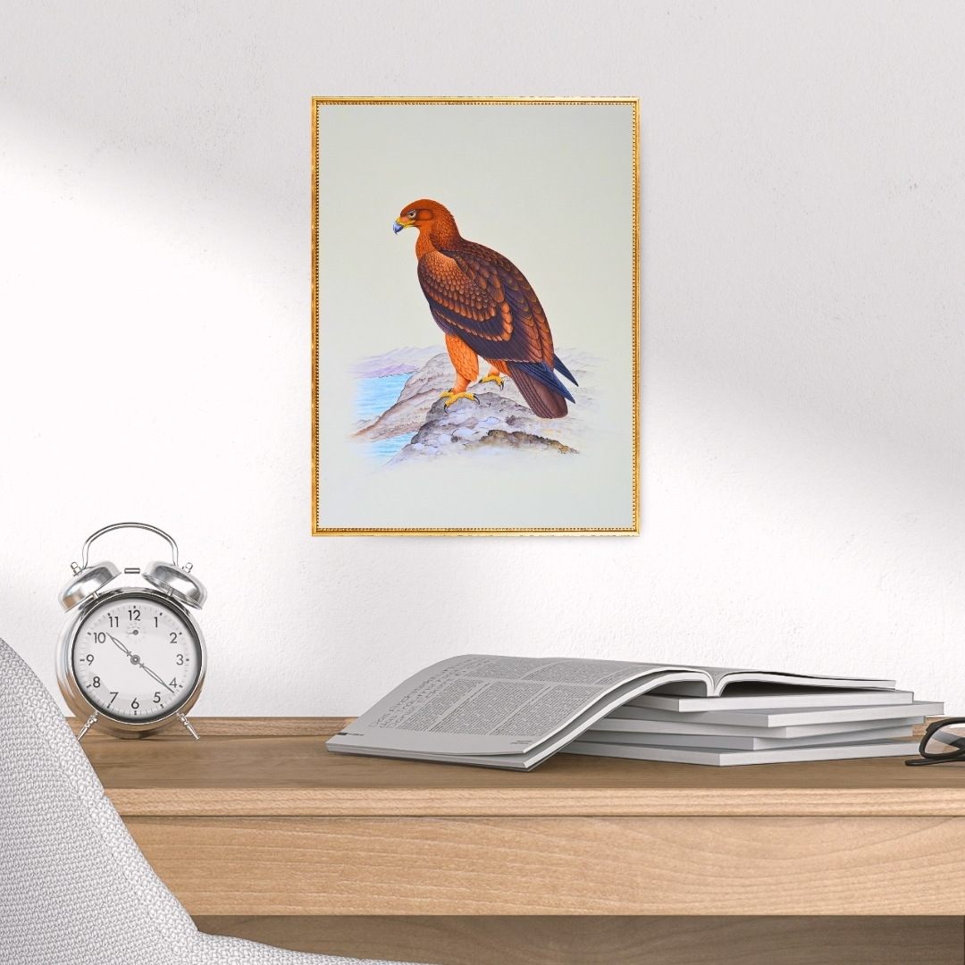 Cliff Guardian by Jaggu Prasad captures an eagle poised at the edge of a rocky shore, its gaze set toward the horizon. The deep burnt orange and earthy browns create a powerful contrast against the soft pale background, reflecting the bird’s silent dominance.