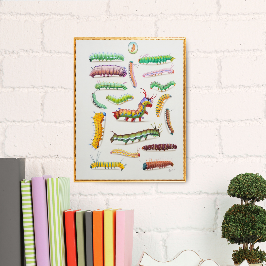 In 'On the Leaf’s Edge', Jaggu Prasad presents that which is small and easily overlooked, as a spectacle of colour and craft. Each caterpillar, painted in luminous shades of green, amber, lilac, and crimson, occupies its own narrow world. The variety of textures is refreshing: smooth segments, spiny ridges, and soft, translucent forms reveal the artist’s microscopic attention to structure. The circular cocoon motif at the top acts like a quiet reminder of what’s to come. A life mid-transition, resting before flight. The title speaks to the fragility of this moment: each caterpillar quite literally living on the edge, suspended between what it is and what it will become. Prasad’s work here honours the beauty that lies in the smallest act of persistence.