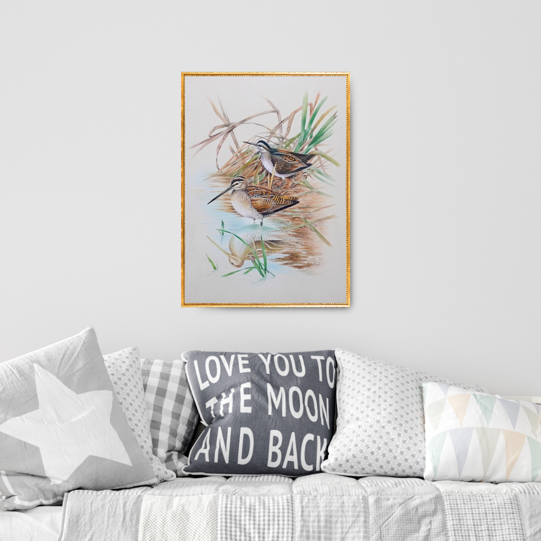 This observant 18x24 inch artwork hand-painted with water colours on paper is perfect for admirers of wetland birds, collectors who value strategy and teamwork depicted in art, and those who see beauty in stillness shared between forms.